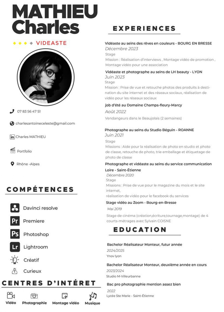 J'aime développer ma créativité au sein de projets vidéo ou photographiques, en capturant des moments uniques et en racontant des histoires à travers mes images